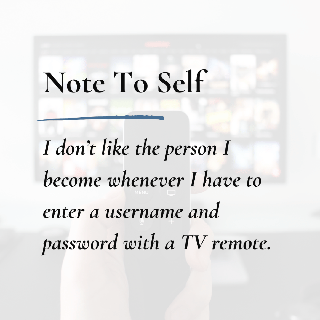 There’s nothing that tests my character quite like entering a username and password with a TV remote. Somewhere between hunting for the letter “Q” and realizing my password has a capital letter, number, and a symbol, I morph into a person I don’t recognize—one who mutters, sighs, and questions all of modern technology.